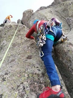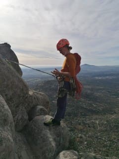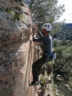 - Profesor con titulación oficial (Técnico deportivo escalada), material colectivo, arnés, casco y pies de gato.